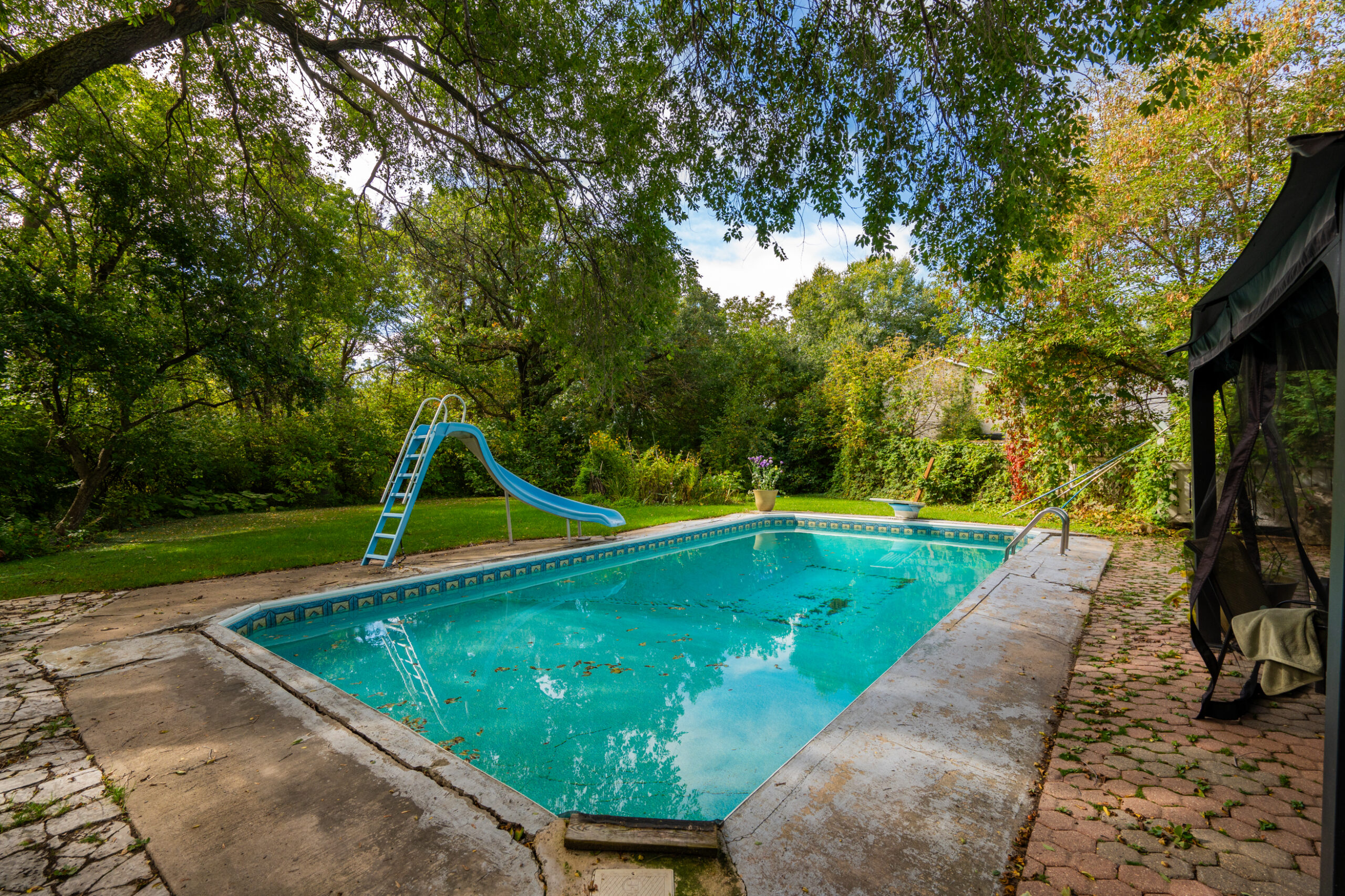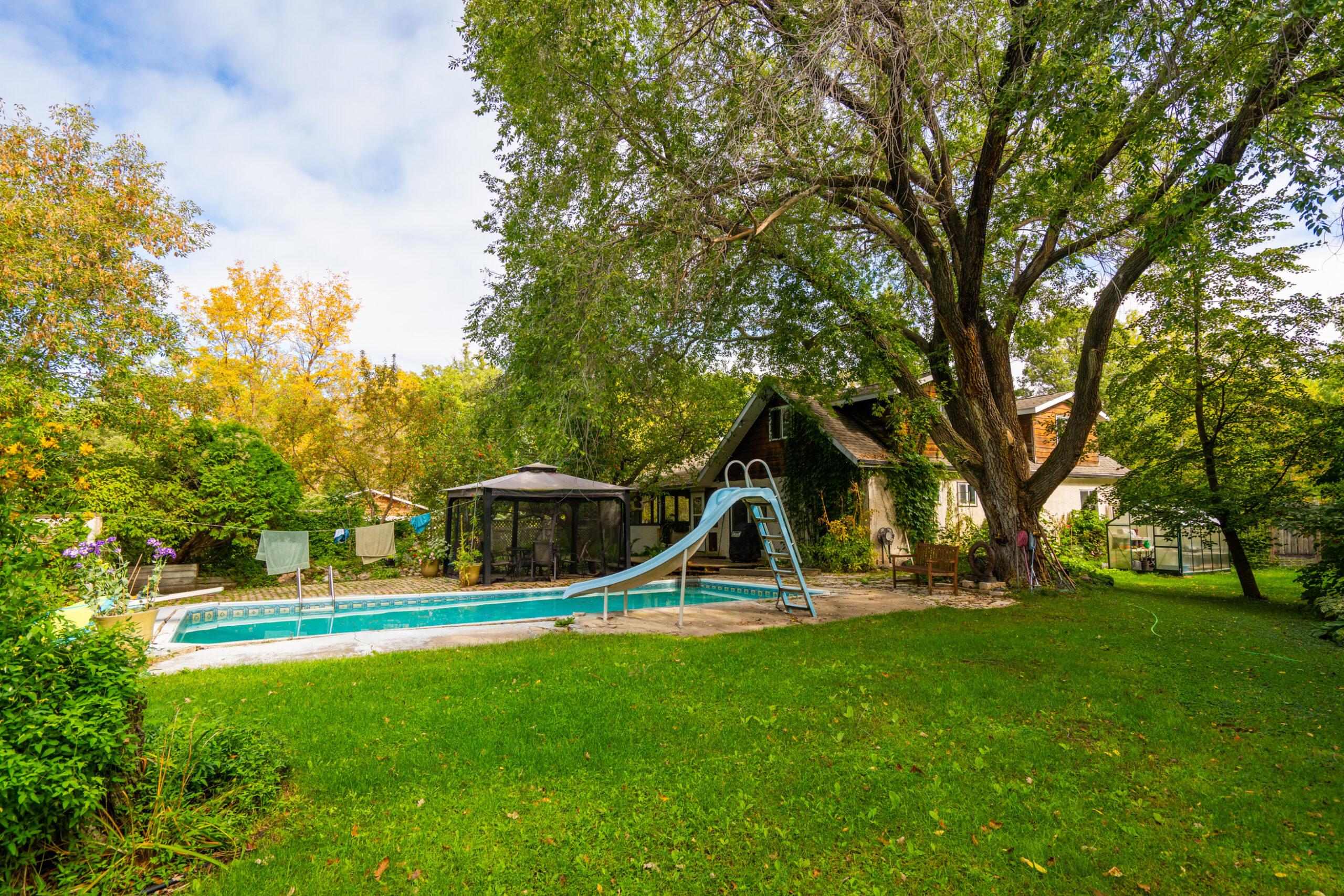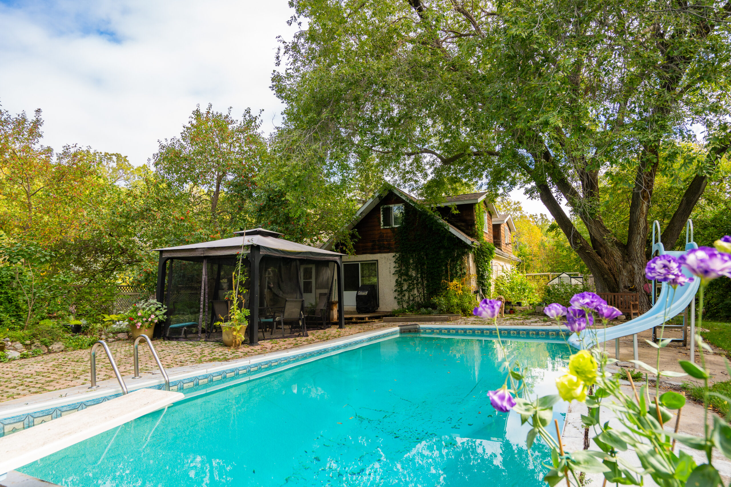 Step into 2,163 sqft of timeless charm where thoughtful design meets everyday comfort. The heart of the home is a spacious great-room layout that seamlessly blends the kitchen, dining, and living areas—perfect for hosting gatherings or enjoying cozy family nights. The kitchen offers ample counter space and cabinetry, while the living room invites relaxation with warm natural light and open sightlines. On the main floor, you'll find a bright and versatile den/library ideal for remote work or quiet reading, a full bathroom, and a generous mudroom with built-in storage. The primary suite is a private retreat featuring a walk-in closet and a spa-inspired ensuite. Step outside to a screened porch and BBQ deck with stunning western exposure, overlooking a beautifully landscaped yard with an in-ground pool, lush gardens, and manicured lawn—your own private oasis for summer entertaining. Upstairs, two oversized bedrooms with rich wood paneling and expansive windows offer sweeping views of the surrounding landscape, creating a cozy, cabin-like feel with elevated style. This home is more than just a place to live—it’s a lifestyle. Unique architectural touches, serene outdoor spaces, and a layout designed for both function and flair make it truly one of a kind.